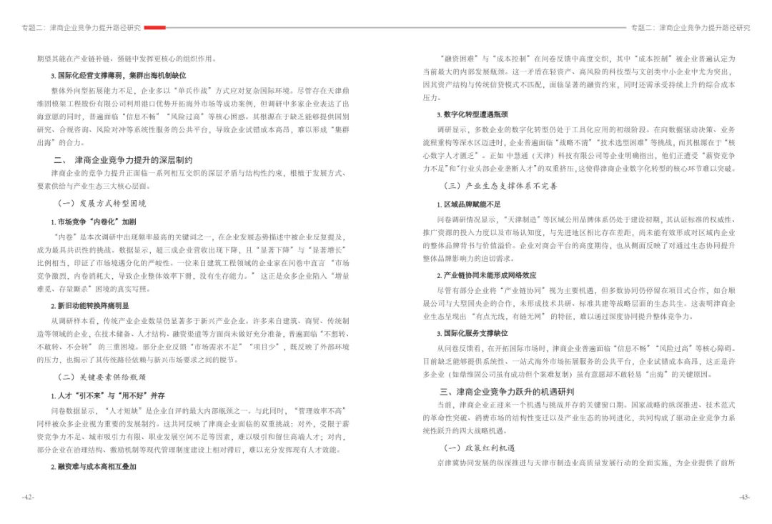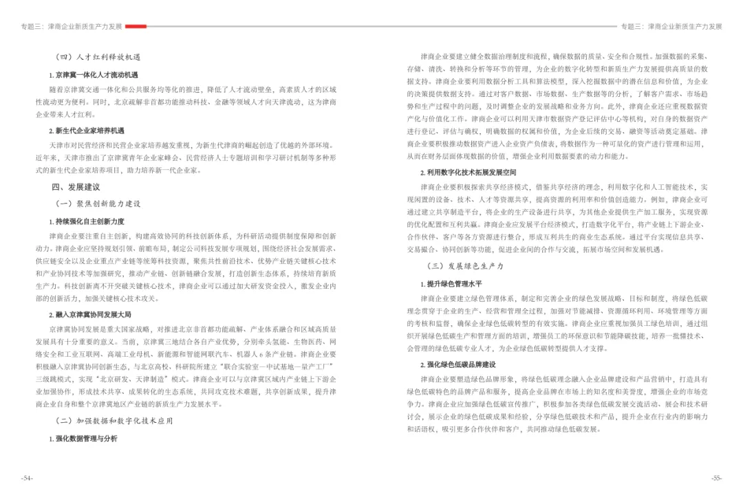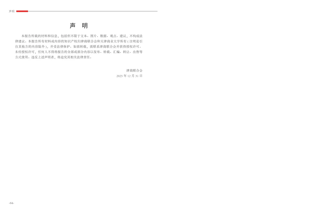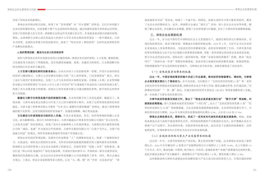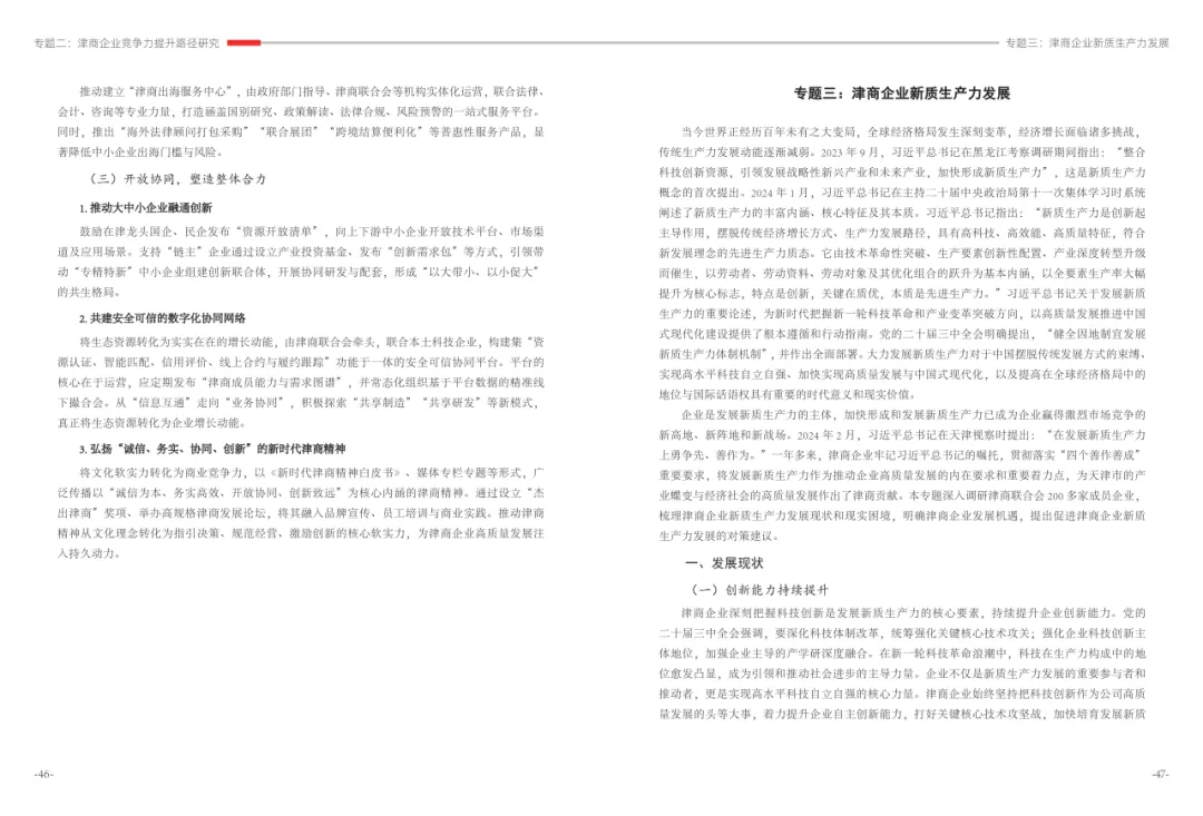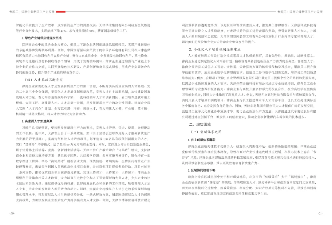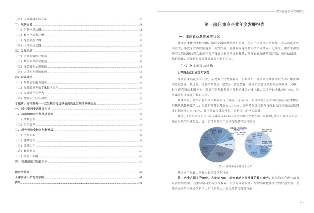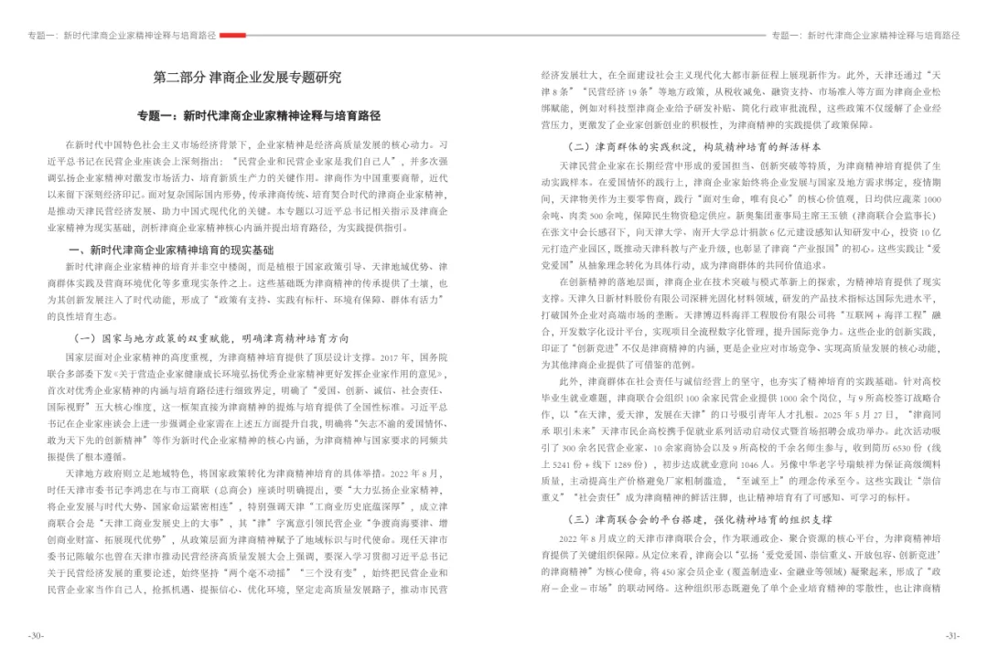 《津商企业发展白皮书》是反映天津市民营经济最新动态和发展前沿的权威报告,围绕天津民营企业及企业家的发展亮点、现实困境与成长模式进行专题研究,重点聚焦于新质生产力发展、天津民营企业家精神培育、企业核心竞争力提升等关键方向,力求内容兼具全面性与专业性。全面呈现了津商企业在新旧动能转换中的现实基础与发展潜力,既看到传统产业稳中有进,也看到新兴产业加速成长。面对市场内卷、成本上升等挑战,津商企业正以创新驱动、数字化转型和绿色发展为主线,主动融入国家战略和区域协同发展大局。希望广大津商坚定信心、守正创新,凝聚合力、勇担使命,共同书写津商高质量发展的新篇章。
