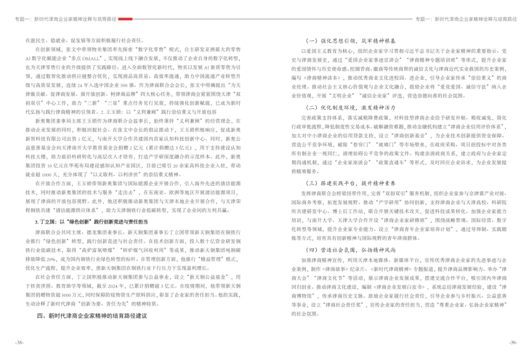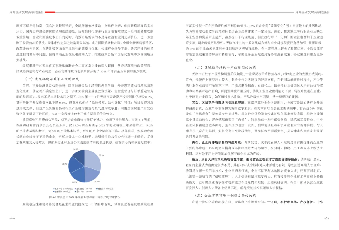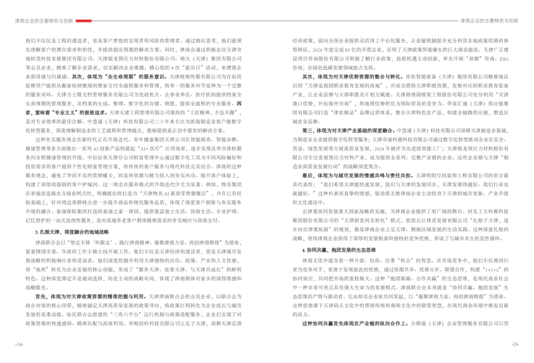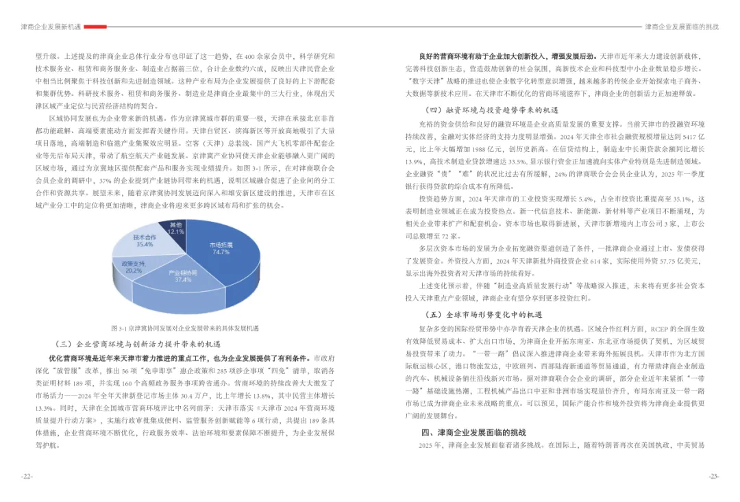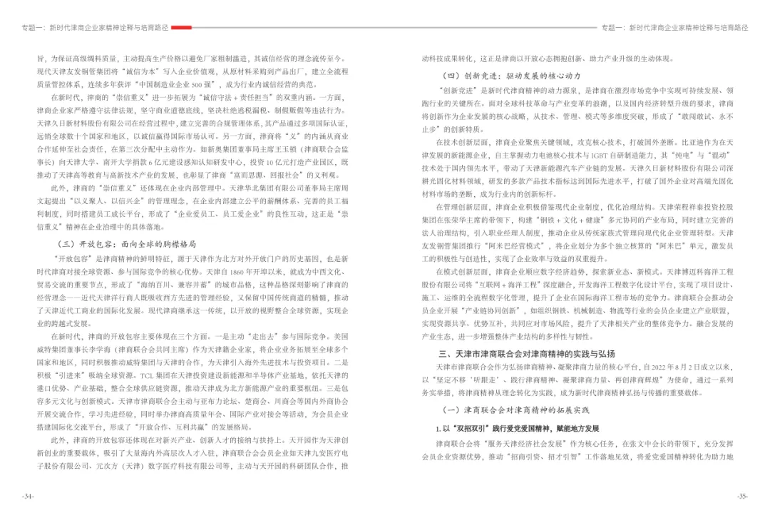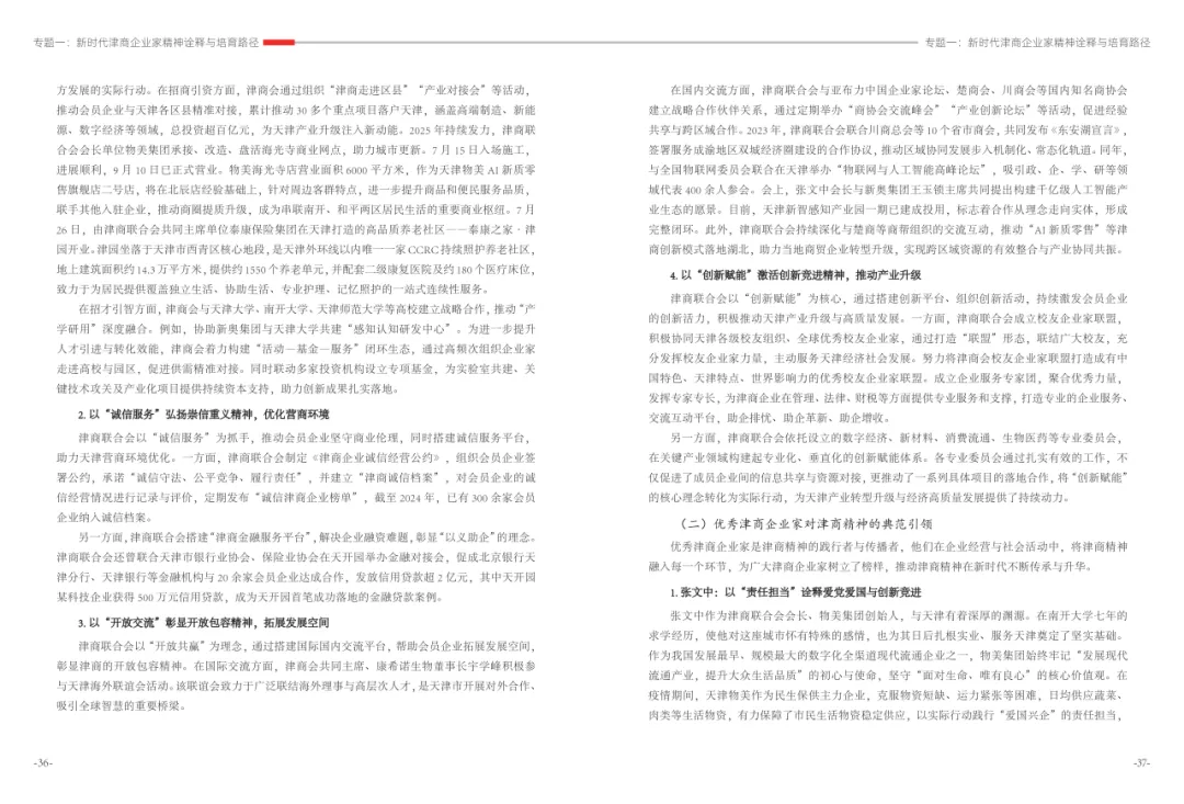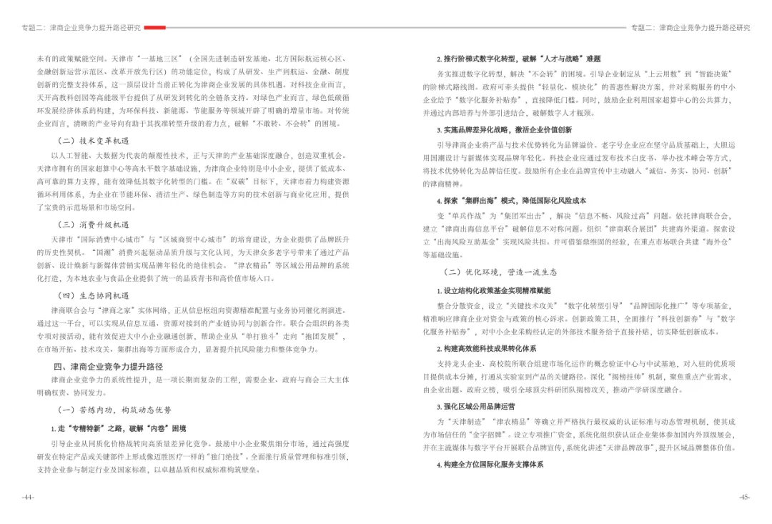 《津商企业发展白皮书》是反映天津市民营经济最新动态和发展前沿的权威报告,围绕天津民营企业及企业家的发展亮点、现实困境与成长模式进行专题研究,重点聚焦于新质生产力发展、天津民营企业家精神培育、企业核心竞争力提升等关键方向,力求内容兼具全面性与专业性。全面呈现了津商企业在新旧动能转换中的现实基础与发展潜力,既看到传统产业稳中有进,也看到新兴产业加速成长。面对市场内卷、成本上升等挑战,津商企业正以创新驱动、数字化转型和绿色发展为主线,主动融入国家战略和区域协同发展大局。希望广大津商坚定信心、守正创新,凝聚合力、勇担使命,共同书写津商高质量发展的新篇章。