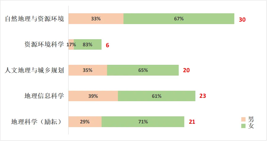2025届本科毕业生100人:自然地理与资源环境专业30人,资源环境科学专业6人,人文地理与城乡规划专业20人,地理信息科学专业23人,地理科学(励耘)专业21人。