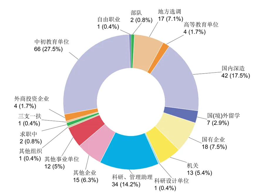 2025届非定向硕士生就业范围较广,选择呈现多元化。升学深造的人数共49人,占比20.4%;共66人入职中初教育单位,占比27.5%;13.8%的毕业生进入各类企业;7.1%的毕业生成为选调生,10.4%的毕业生进入机关和事业单位。