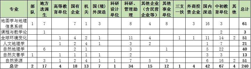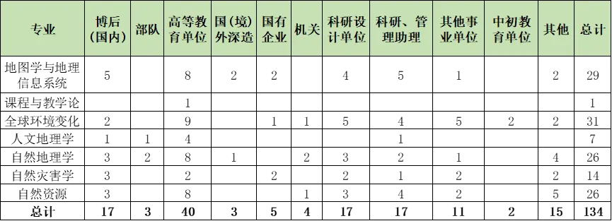 自然地理学、自然资源和全球环境变化专业毕业生选择中初教育单位的人数较多;除课程与教学论外,其他专业均有选择继续深造的毕业生;地方选调生主要分布在地图学与地理信息系统、自然地理学、自然资源和课程与教学论专业;地图学与地理信息系统专业选择企事业单位的人数也较多,其中11人选择企业(含国有企业和民营企业),9人选择机关事业单位;人文地理学和课程与教学论专业毕业生选择机关单位和中初教育的人数占比较大;自然灾害学专业毕业生在各行业的分布相对均匀。