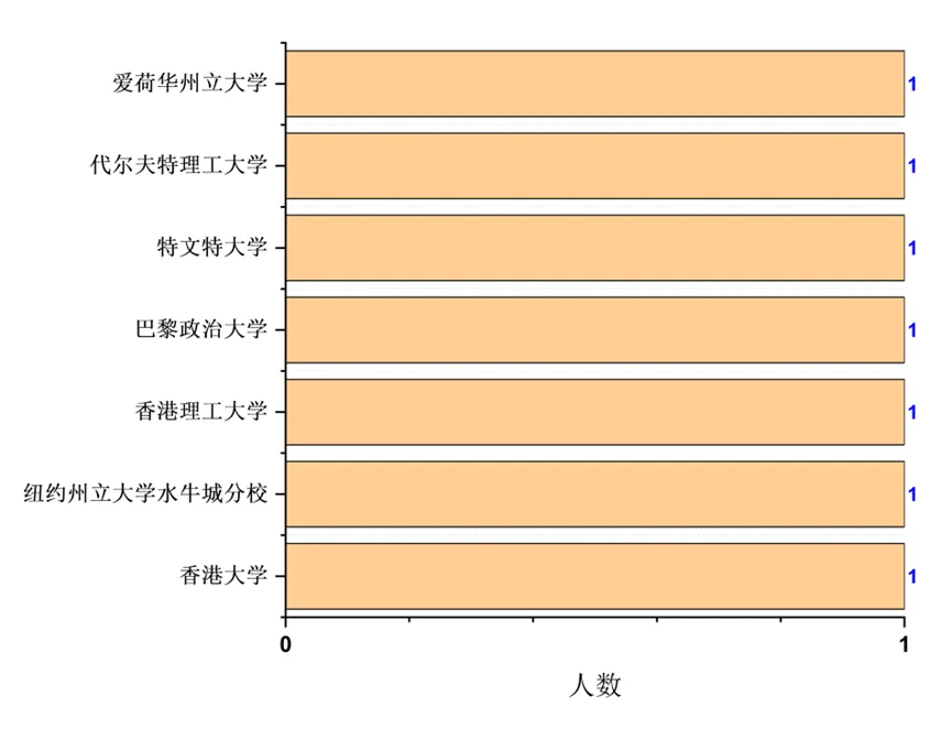 硕士选择出国(境)深造共7人,分别前往爱荷华州立大学(美国)、巴黎政治大学(法国)、代尔夫特理工大学(荷兰)、纽约州立大学水牛城分校(美国)、特文特大学(荷兰)、香港大学(香港)和香港理工大学(香港)。