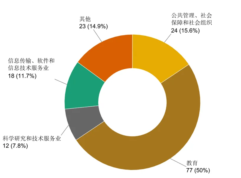 进入各单位工作的154名硕士毕业生(除去深造、助理岗位、自由职业和未就业),有50%从事教育行业,15.6%从事公共管理、社会保障和社会组织行业,11.7%从事信息传输、软件和信息技术服务业,7.8%从事科学研究和技术服务业。