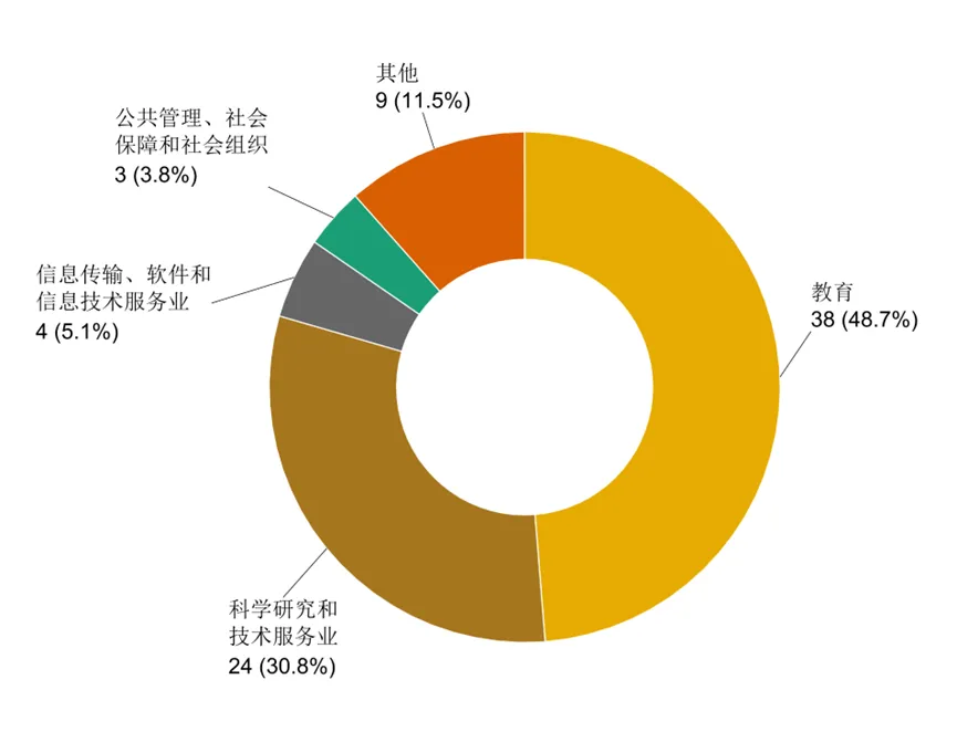 进入各单位工作的78名博士毕业生(除去博后、深造、助理岗位、自由职业和未就业),48.7%的博士毕业生选择从事教育行业,30.8%选择从事科学研究和技术服务业,其他行业方向还包括信息传输、软件和信息技术服务业和公共管理、社会保障和社会组织等。
