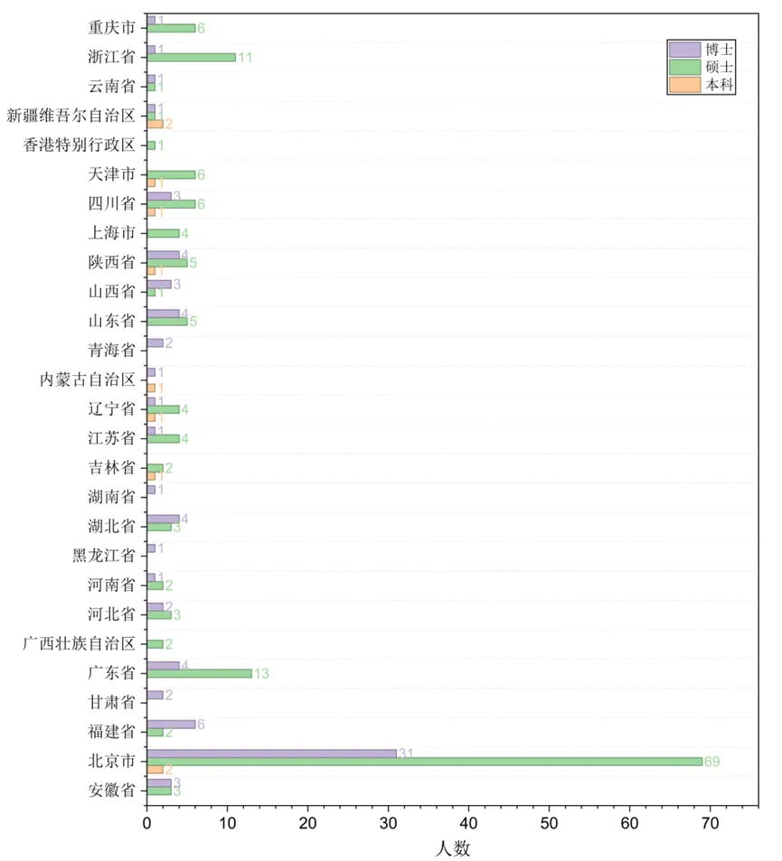 进入各单位工作的10名本科毕业生,除各有2位在北京和新疆维吾尔自治区,在吉林省、辽宁省、内蒙古自治区、陕西省、四川省、天津市等地各有1名;154名硕士毕业生,去往北京、广东和浙江的共93人,占比达60.4%,去往西部地区的有20人,占比13.0%;77名博士毕业生,去往北京和福建的共37人,占比48.1%,去往西部地区的有14人,占比18.2%。