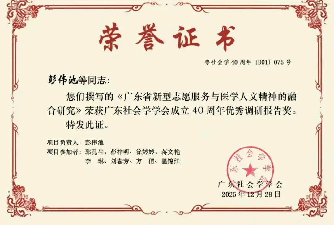 近日,广东社会学学会公布了2025年度广东社会学学会工作优秀调研报告获奖名单,经审核、初评、复评、终审和公示,我院彭伟池同志撰写的调研报告《广东省新型志愿服务与医学人文精神的融合研究》荣获广东社会学学会成立40周年优秀调研报告奖。
