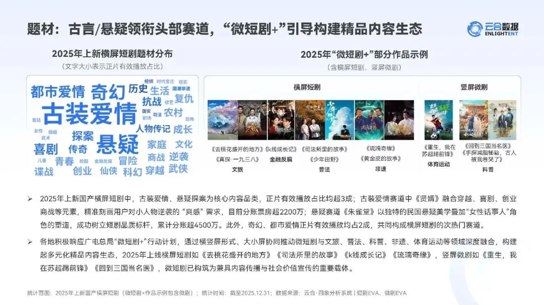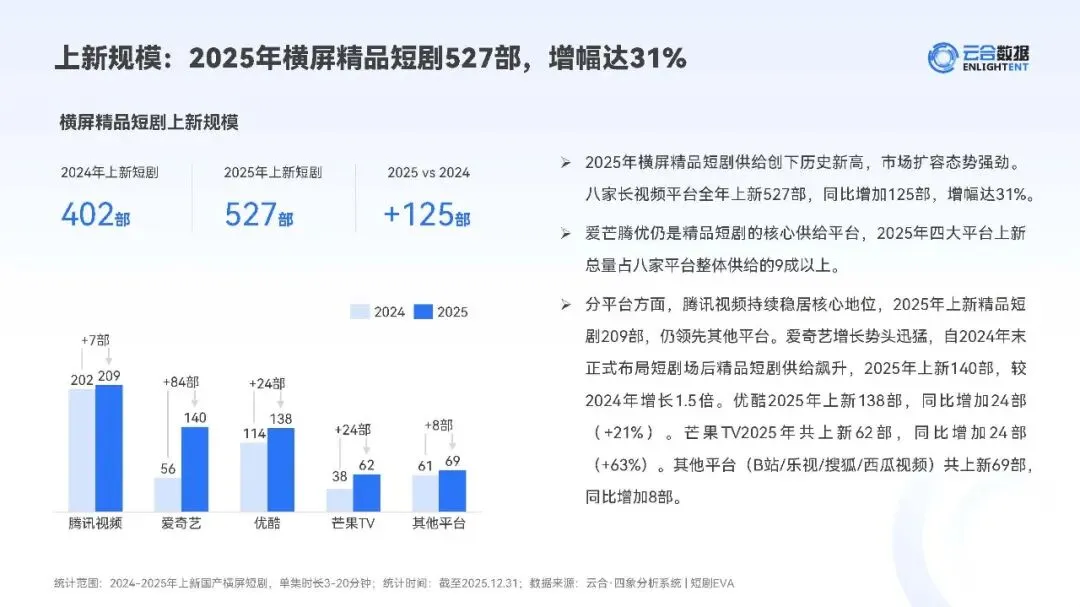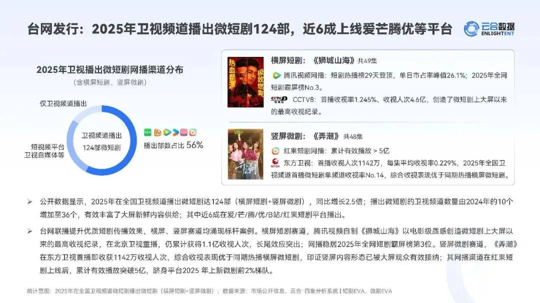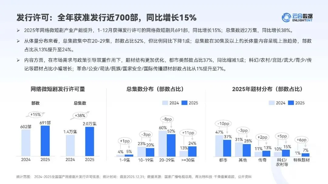 2025年上新短剧出品主体覆盖近千家机构,影视公司、视频平台出品部数分别占72%、20%,正片有效播放分别占54%、44%;官方/行业机构出品短剧增多,部数占比从2024年不足1%提升至5%。