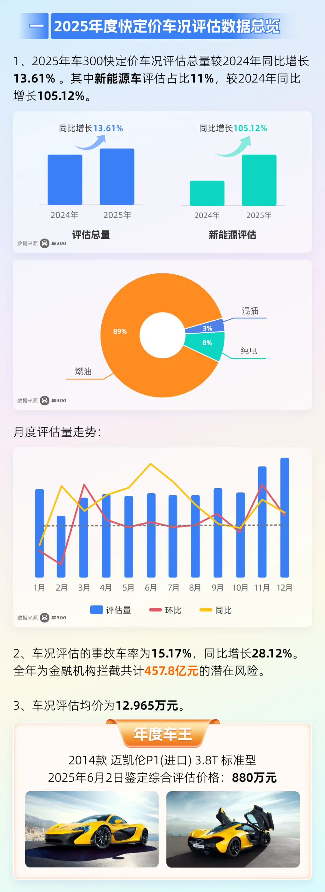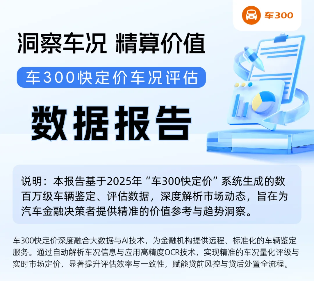 本报告基于“车300‘快定价’系统”在2025年处理的数百万级车辆鉴定与评估数据分析而来。该系统深度融合车况检测、历史维修、出险记录等多维数据,通过标准化的远程车况鉴定与高精度OCR技术,为金融机构提供高效、可靠的车辆价值判定依据与市场趋势洞察。