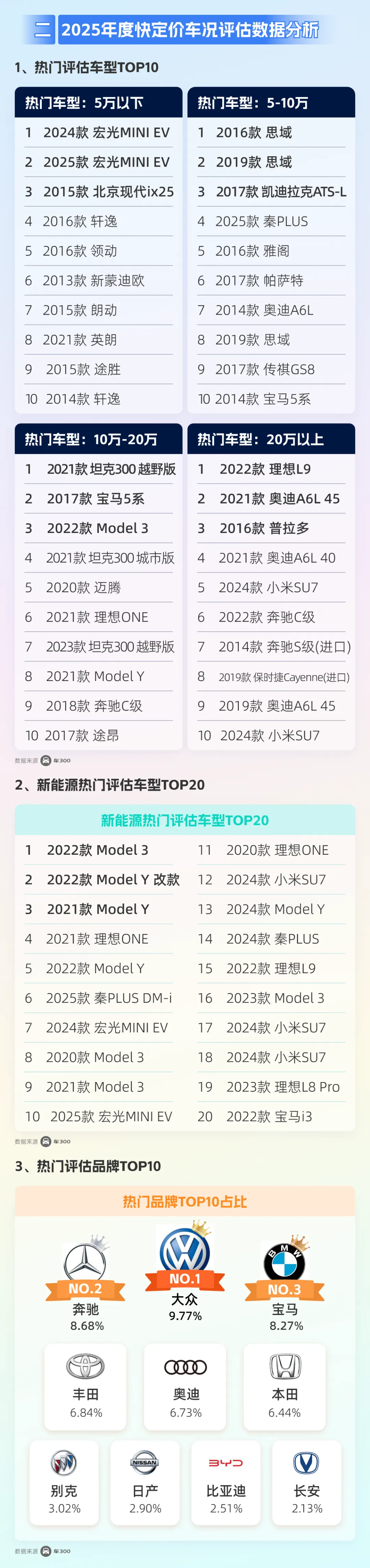 基于车300“快定价”的数据洞察,客户来源与类型日趋丰富,印证了金融渗透率的持续深化。本报告将通过不同价格区间的高频评估车型榜单,精准刻画各预算层级消费者的真实偏好,旨在为从业者提供前瞻性的决策参考与市场洞察。