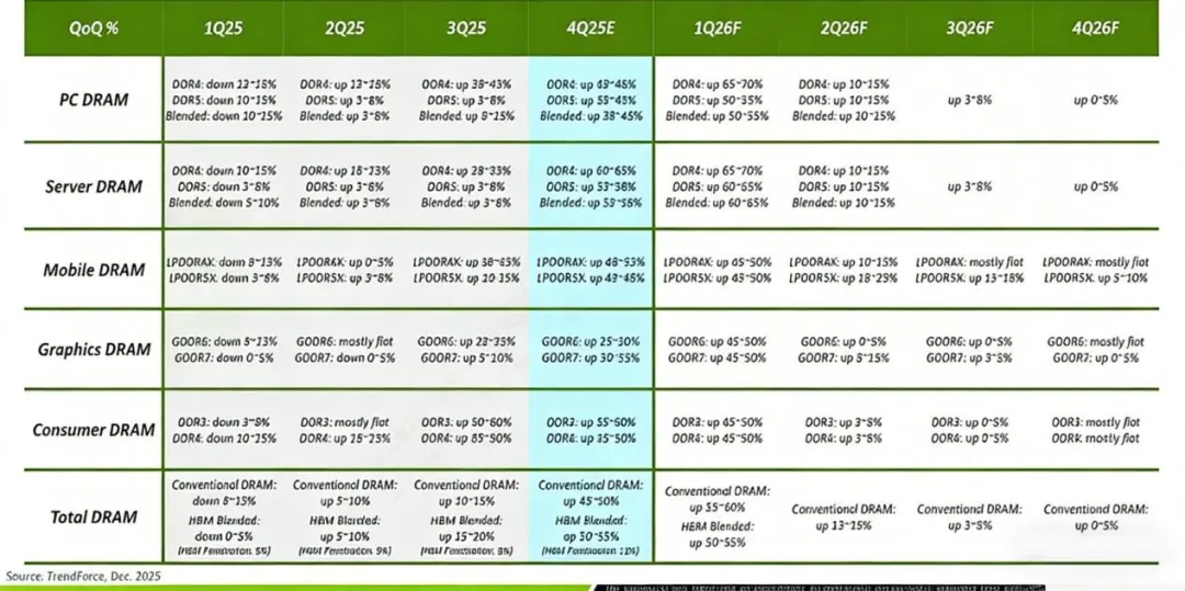 DDR5因AI服务器推动价格持续跳涨,盈利能力预计2026年上半年反超HBM;而DDR4因产能被加速退出,出现“僵尸化”现象,现货价格一度暴涨1800%,形成“旧比新贵”的稀缺悖论。