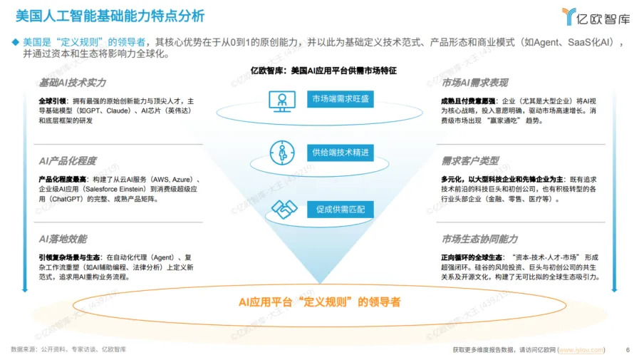 核心优势在于从0到1的原创力。它定义了Agent(智能体)、SaaS化AI等新范式,并通过资本与生态将影响力全球化。从GPT、Claude到英伟达芯片,美国手握基础模型、芯片和框架的“技术主权”。