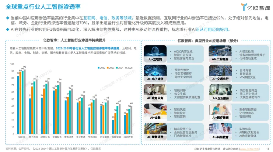 目前,中国AI渗透率最高的行业是互联网(近92%)、电信、政务和金融(均超70%)。这表明,数字化基础好、数据丰富或转型压力大的行业,已率先进入深度应用阶段。