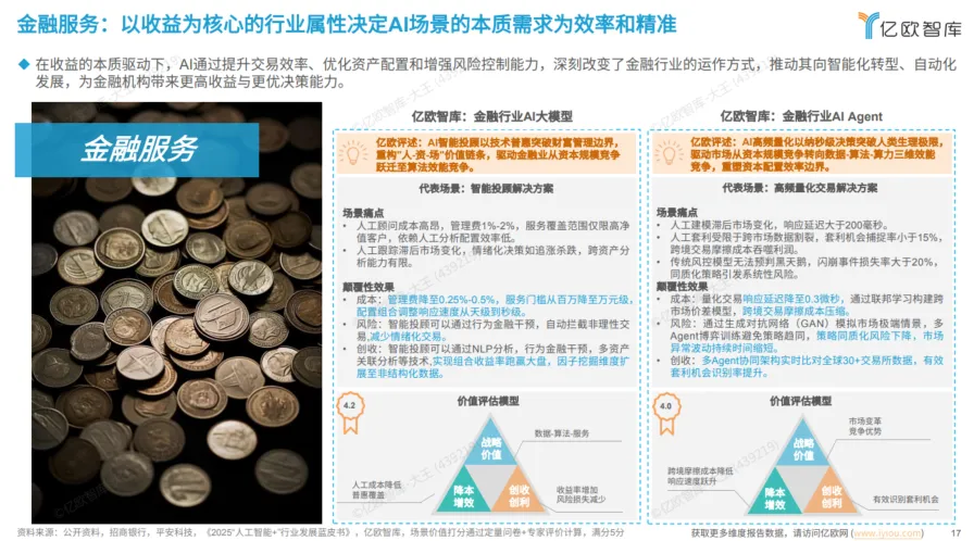 ? 金融(诉求:效率与精准):AI高频量化交易将响应延迟降至0.3微秒,突破人类生理极限;智能投顾则将服务门槛从百万元降至万元级。