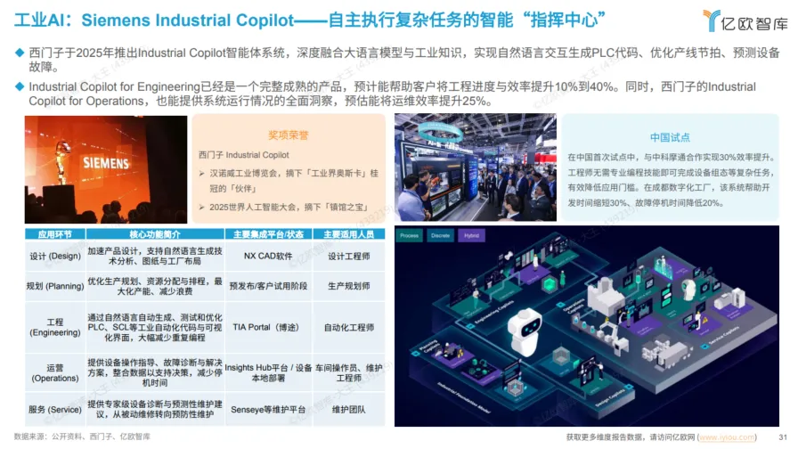 ? 工业制造(诉求:安全与效能):西门子 Industrial Copilot 让工程师用自然语言生成PLC代码,在中国试点中提升效率30%,故障停机时间降低20%。