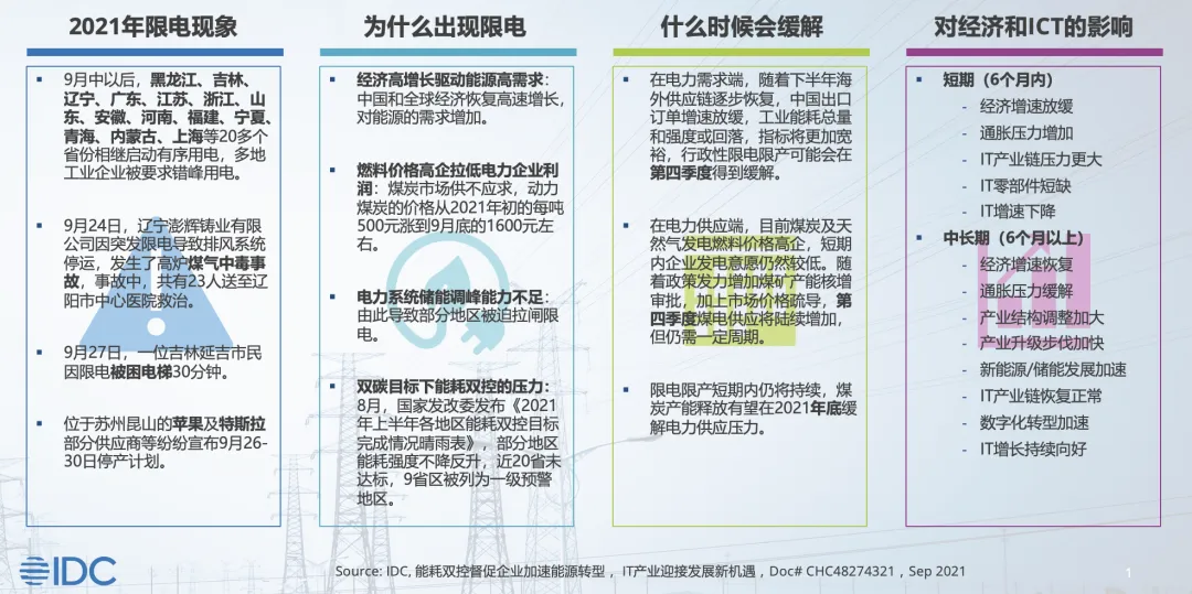 IDC研究认为,本轮能耗双控考核只是限电限产的部分原因,上半年工业制造繁盛、能耗管控放松、电力供应结构性紧缺才是主因。