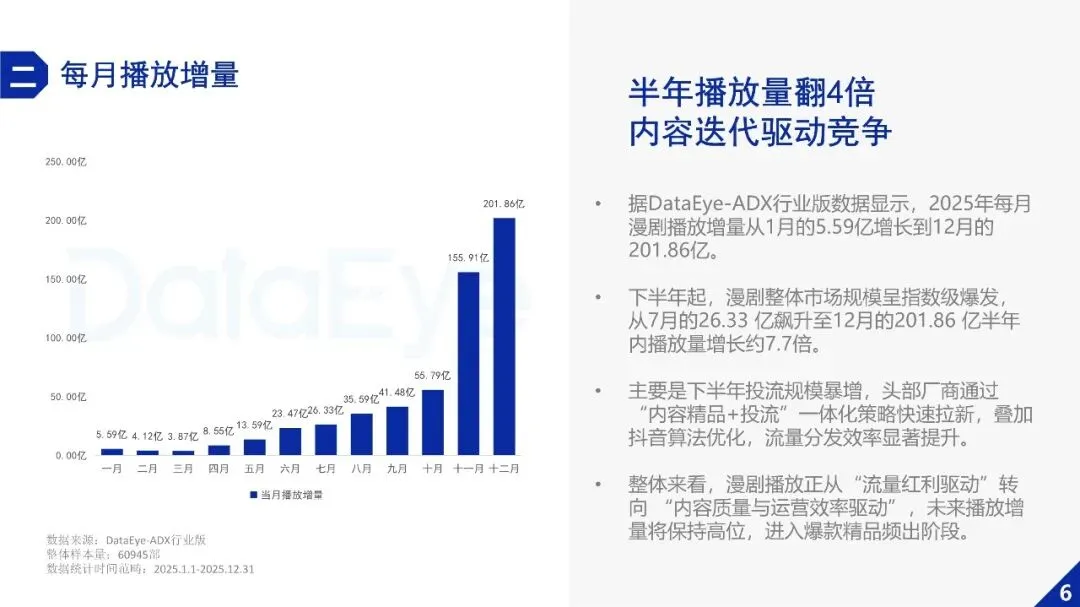 2025年成为漫剧行业爆发元年,市场呈现全方位增长态势。数据显示,2025年漫剧市场规模达168亿元,预计2026年将突破243.6亿元,涨幅高达45%。供给端迎来史诗级爆发,仅抖音端原生漫剧上线数就突破6万部,较此前实现量级跨越。
