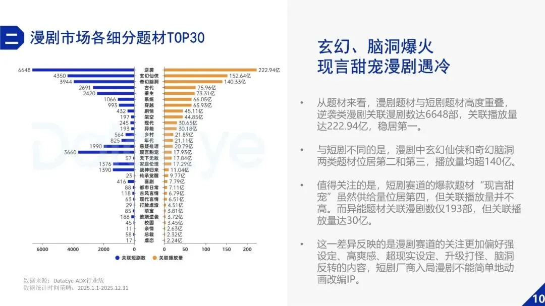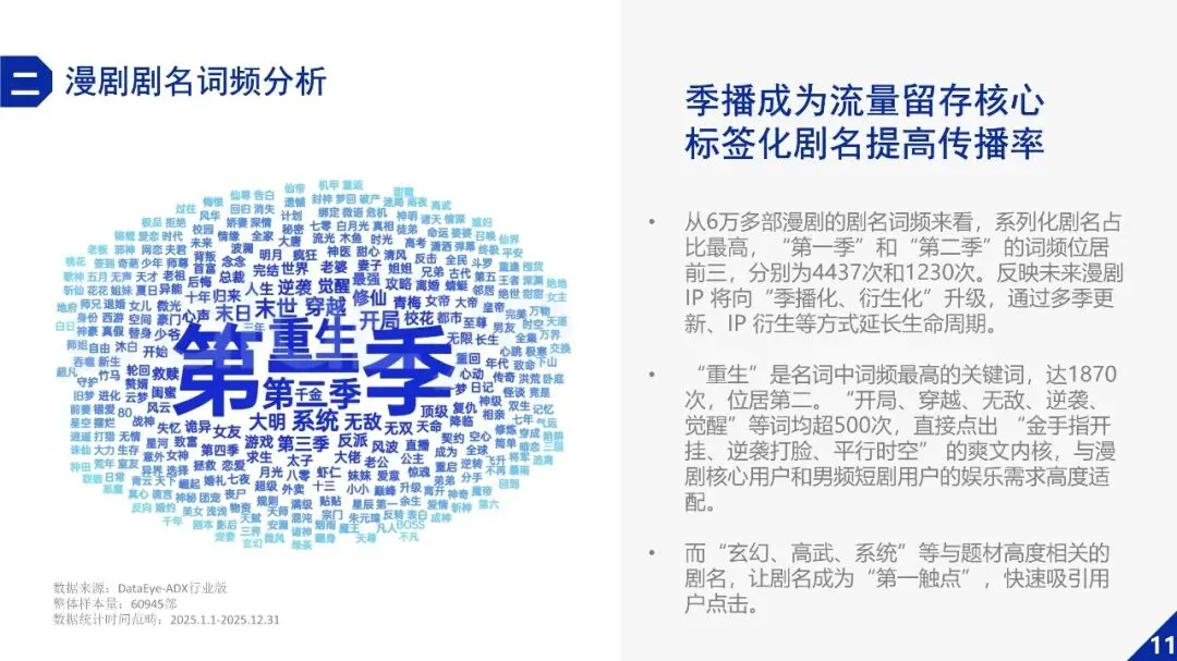 内容层面,表情包/沙雕漫剧占比超四成,稳居品类第一,AIGC/仿真人漫剧增速惊人,全年增长181倍,成为潜力赛道。题材上,玄幻仙侠、奇幻脑洞、逆袭类内容备受青睐,强设定、高爽感的内容更贴合用户需求。行业模式正从付费为主向“付免混合”转型,免费化浪潮加速到来。
