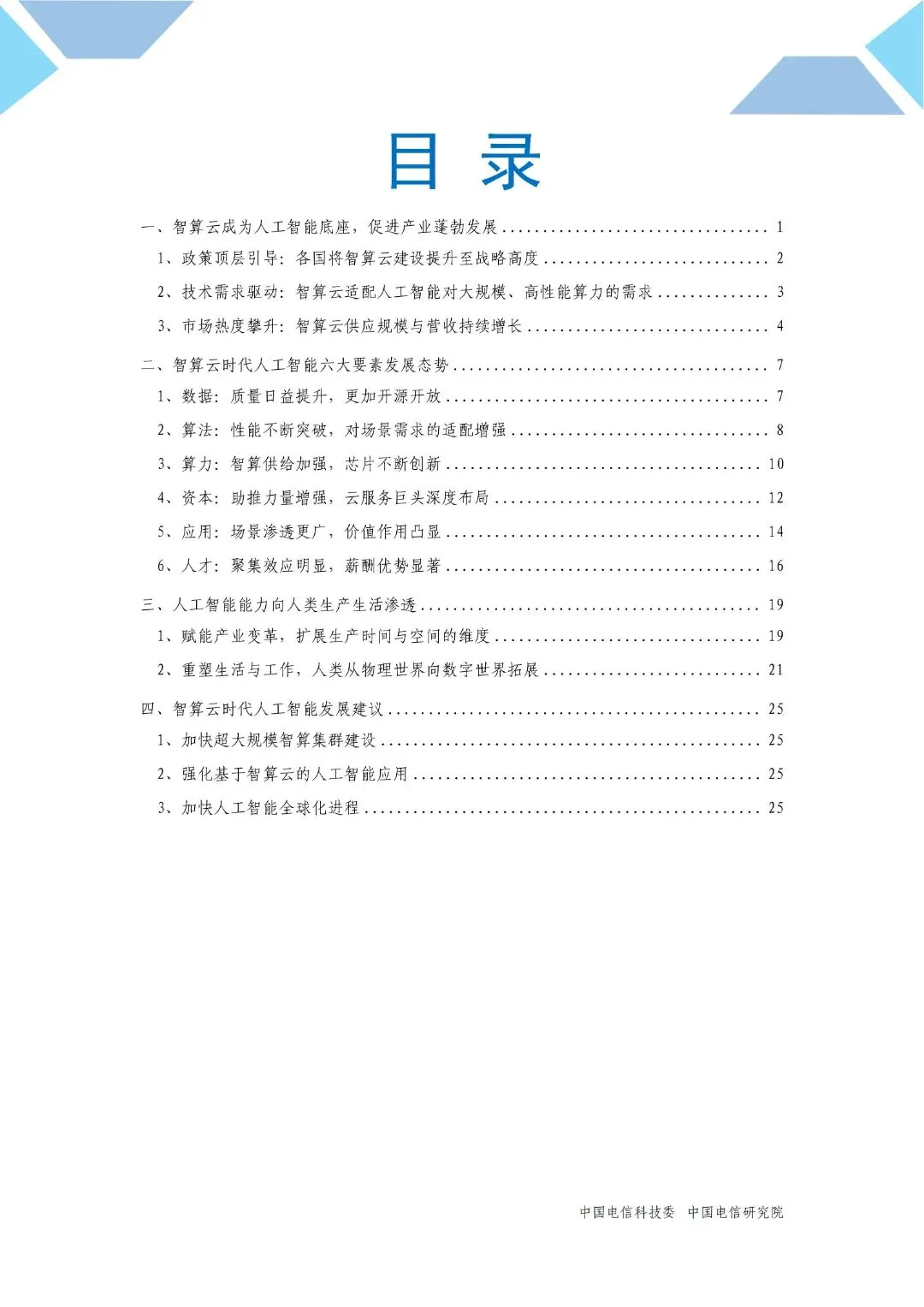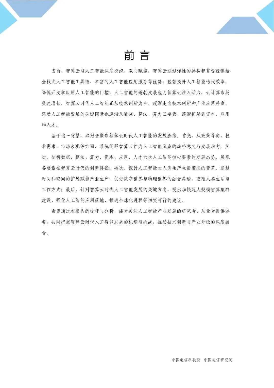 导读:本报告聚焦智算云时代人工智能的发展脉络。首先,从政策导向、技术需求、市场表现等方面,系统阐释智算云作为人工智能底座的战略意义与发展动力;其次,剖析数据、算法、算力、资本、应用、人才六大人工智能核心要素的发展态势,展现各要素在智算云时代的创新路径;再次,探讨人工智能对人类生产生活带来的变革,通过时间和空间的扩展赋能产业生产,促进数字世界与物理世界的融合渗透,重塑人类生活与工作方式;最后,针对智算云时代人工智能发展的关键方向,提出加快超大规模智算集群建设、强化人工智能应用落地、推进全球化进程等切实可行的建议。