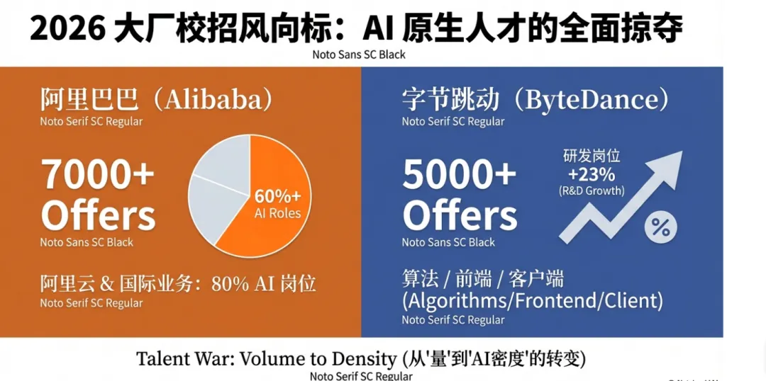 互联网大厂: 字节跳动 2026 校招规模扩大至 5000+,研发岗位增长 23%;阿里计划发放 7000+ Offer,AI 岗位占比超 6 成。