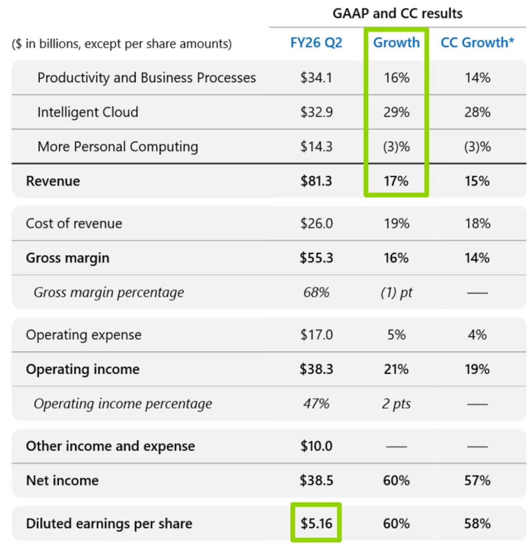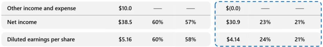 生产力与业务流程收入341亿美元,同比增长16%。智能云收入329亿美元,同比增长29%。更多个人计算收入143亿美元,同比下降3%。Azure及其他云服务收入同比增长39%,按固定汇率为38%,成绩并不差。