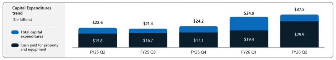 但是单季资本开支375亿美元,同比增加约66%,刷新纪录。换算一下,资本开支约等于本季收入的46%。这在成熟软件巨头里几乎是另一种商业模式,这笔钱主要投向服务器,GPU,CPU。