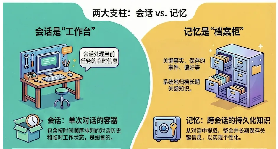 这个类比直接反映了高效智能体的运作方式:会话充当单次对话的临时工作台,而智能体的记忆则是精心整理的文件柜,使其能够在未来的交互中回忆起关键信息。