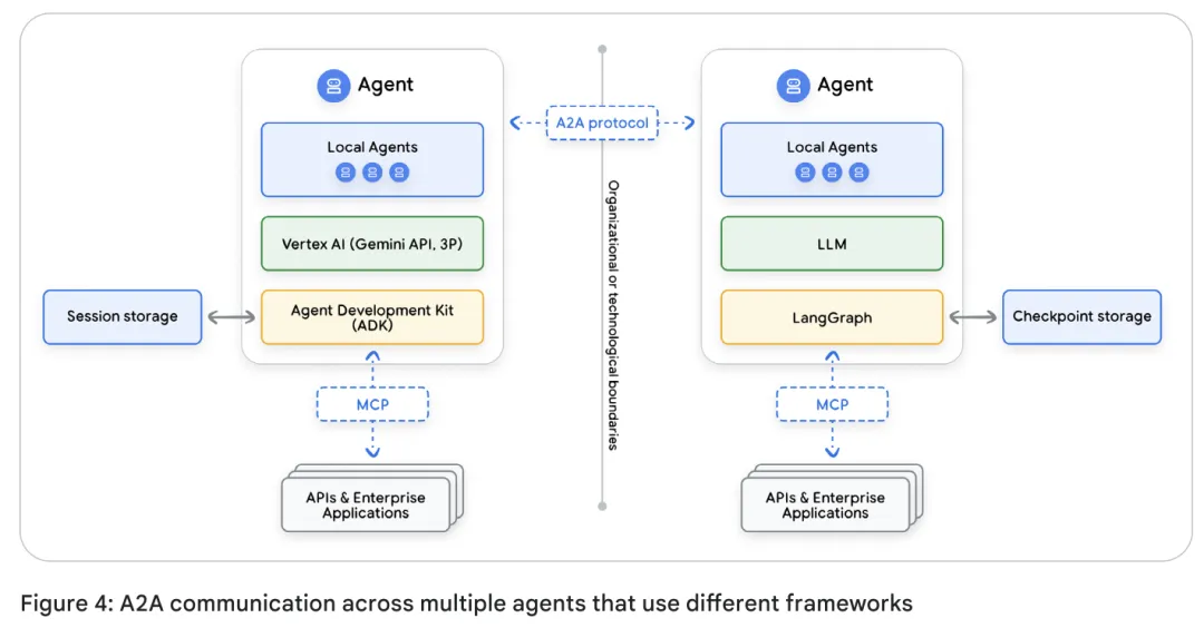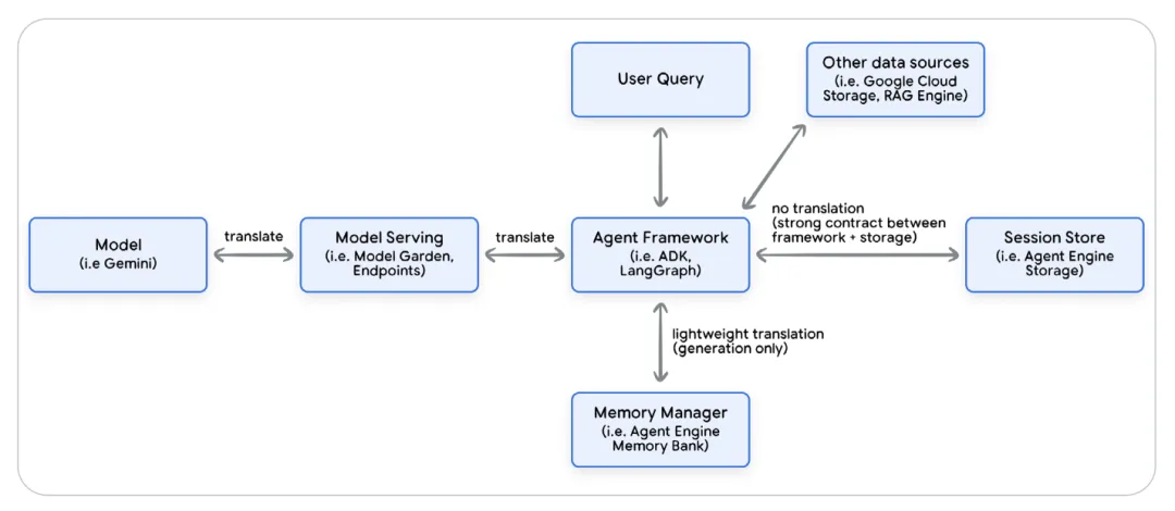 采用标准协议(如 A2A 协议)和框架无关的数据层(Memory Layer),确保异构 Agent(如 ADK 开发的 Agent 与 LangGraph 开发的 Agent)之间能够协作,而不是形成数据孤岛,。