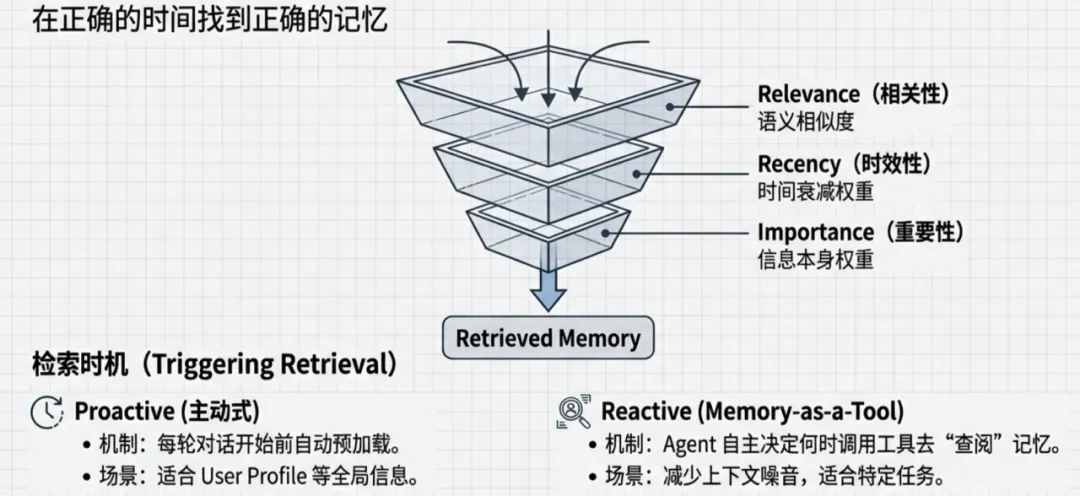 机制:将记忆检索封装为一个 Tool(如 load_memory(query))。Agent 在推理过程中,根据任务需求自主决定是否调用以及查询什么。