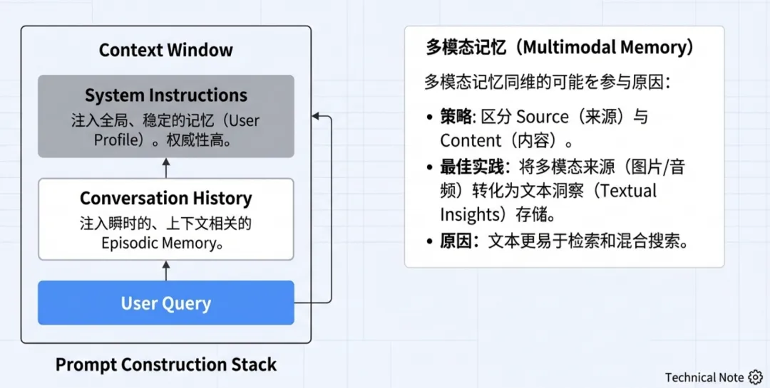 一旦记忆被检索出来,如何将其放置在 Prompt Payload 中(即 Context Placement)直接影响 LLM 的注意力分配和推理逻辑。