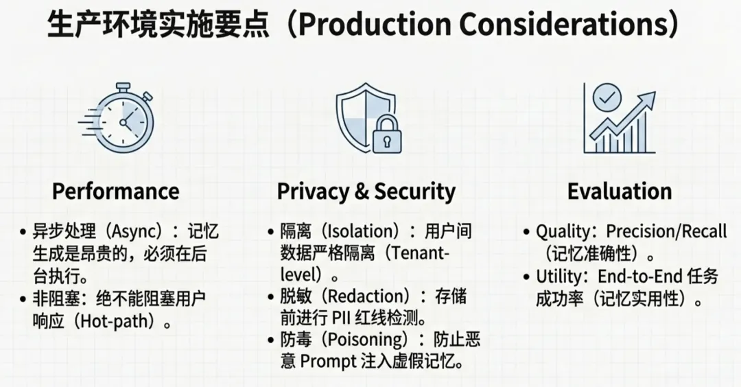 防投毒:针对记忆系统,需防范 Prompt Injection 导致的错误记忆植入。写入前的校验和清洗机制是必要的。
