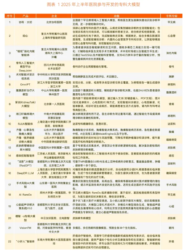 2025 年医疗 AI 最显著的变化集中在大模型突破式演变与医疗机构规模化参与。2023 年起,医疗信息化领域出现 100b 以内的医疗基础模型,但受限于 GPU 等算力设备高投入,仅头部三甲医院能部署。而 DeepSeek-R1 通过参数高效微调(PEFT)、混合专家架构(MoE)等创新降低了大模型入场门槛,加之国产基础模型的突围,推动医疗机构加速部署。截至 2025 年 5 月,国内排名前 100 的医院已全部完善大模型部署,38 家医院进一步研发出 55 个垂直医疗模型,其中 22 个为专科模型。