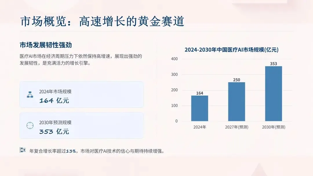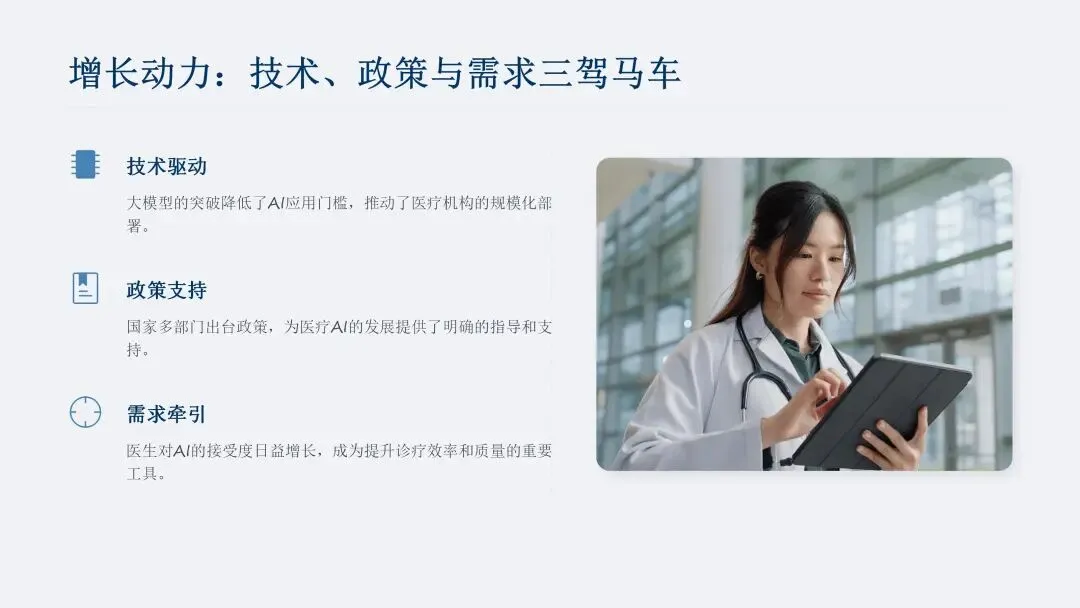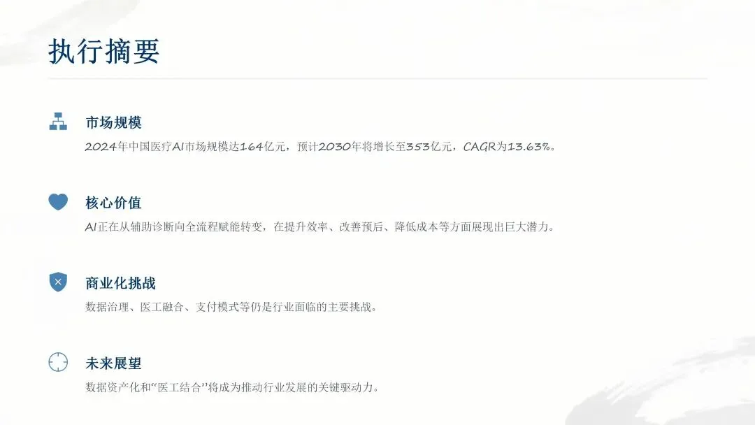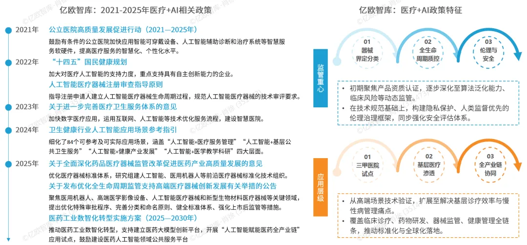 政策层面推进力度持续加大,2025 年 3 月国家药监局发布相关举措征求意见稿,拟制定多病种、大模型领域技术指导原则,简化算法性能优化类产品变更注册要求;2025 年 11 月,国家卫生健康委等五部门联合发布实施意见,提出 24 个重点应用建设方向,要求 2027 年建成高质量数据集、可信数据空间及临床专病专科垂直大模型等,明晰了医疗 AI 的发展路径。