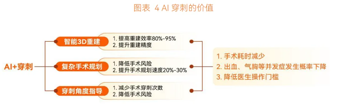 辅助穿刺领域,AI 融合 3D 打印技术,在重建阶段能提高建模效率 80%-95% 及精度,在手术阶段可优化复杂手术规划、指导穿刺角度,降低手术风险、减少并发症。伽奈维医疗的 CR-NAV100 穿刺手术机器人表现突出,其定位成功率、穿刺调整次数、患者 CT 扫描次数均显著优于传统人工穿刺,平均整体手术时间大幅缩短,还降低了手术操作门槛,让低年资医生借助普通 CT 即可开展高质量穿刺治疗。