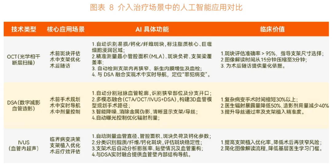 介入治疗场景中,AI 配合 DSA、OCT、IVUS 开展手术规划、导航等应用,核心价值在于提升手术效益,避免不必要的支架植入,降低术后血管再狭窄风险。如 AI+IVUS 能精准处理标准血管切面,将解读时间从 10-15 分钟压缩至 3-5 分钟,但目前仅在常见术式中能提供高准确率判断,仍需更多医院建立丰富数据库支撑。