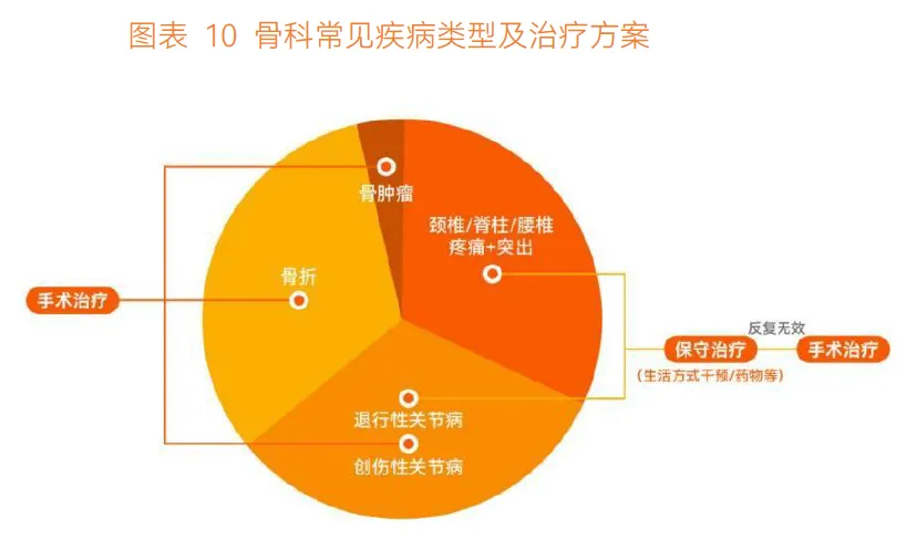 骨科包含多个细分科室,疾病主要分为颈椎脊柱腰椎疼痛或突出、关节退行性或创伤性疾病、骨折三类,治疗方式因病种而异。骨科医生临床工作涵盖疾病治疗、医疗服务、自我提升,其中疾病治疗领域 AI 应用最为集中,难度大且耗时久的环节商业化进程更靠前。