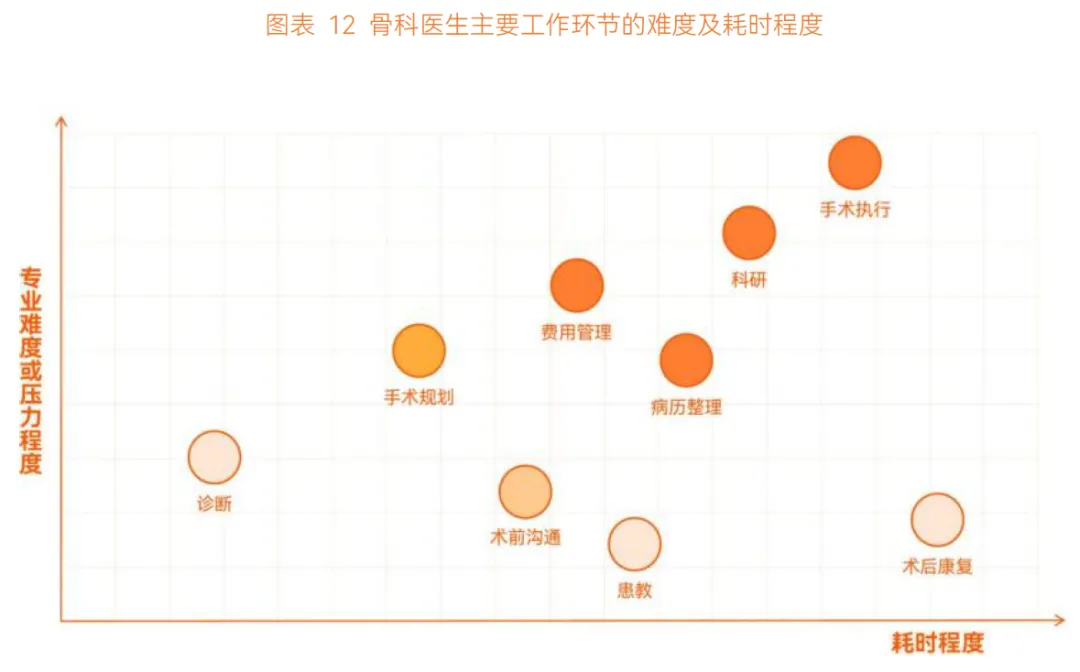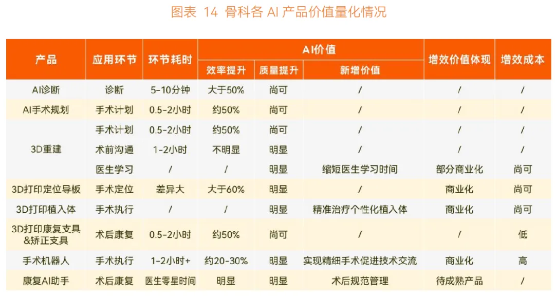 诊断环节,AI 应用渗透率高但商业化落地少。骨科诊断高度依赖影像资料,CT 影像即可满足多数需求,除骨肿瘤外,其他疾病诊断逻辑清晰,数据标准化程度高,契合 AI 应用特性。但这类诊断相对简单、耗时有限,AI 仅能 “锦上添花”,医院付费意愿不足。