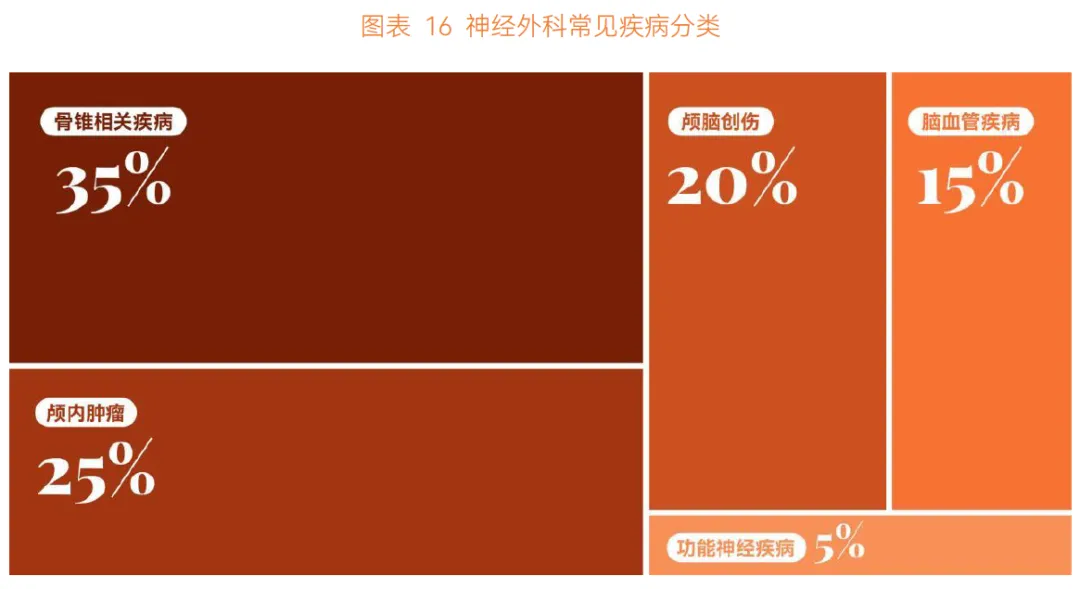 神经外科主要就诊疾病包括脊椎相关疾病、颅脑创伤、颅内肿瘤、脑血管疾病及功能神经性疾病,不同级别医院疾病占比存在差异,50%-80% 的疾病需手术治疗。临床医生工作以疾病治疗、医疗服务、自我提升为主,重点围绕疾病治疗板块展开 AI 应用分析。