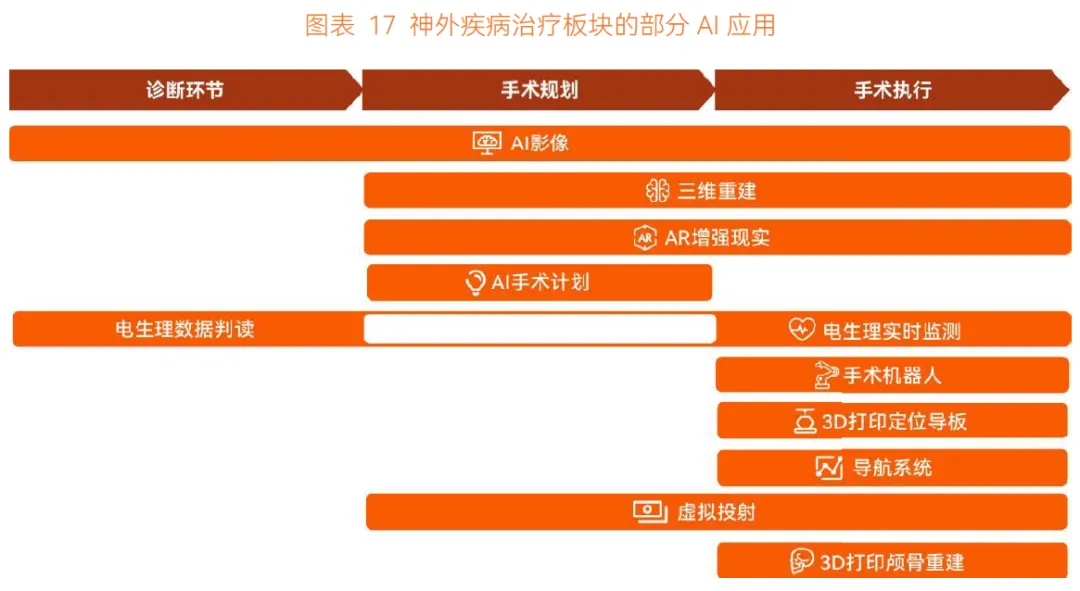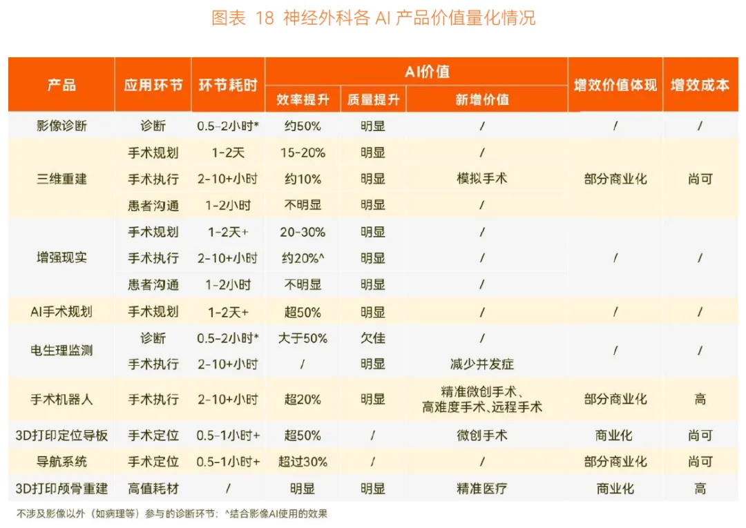 手术执行环节,AI 应用较多且部分有多个品牌可选。手术机器人用于电极植入、穿刺手术等精细度要求高的 4 级大手术,目前辅助手术量占比不足 5%,未解锁新手术类型且成本高昂,接受度和商业化仍有距离。手术定位相关 AI 应用(AI+3D 打印定位板、AI 定位系统等)使用率高,能缩短整体手术时间约三分之一,减少并发症,获得高认可度;电生理实时监测能术中实时风险提醒,避免神经功能受损,临床体验打分达 90-95 分;3D 颅骨重建在限期手术中表现突出,缩短等待时长,在美观和功能性上效果好,患者端获益明显,商业化进展快。