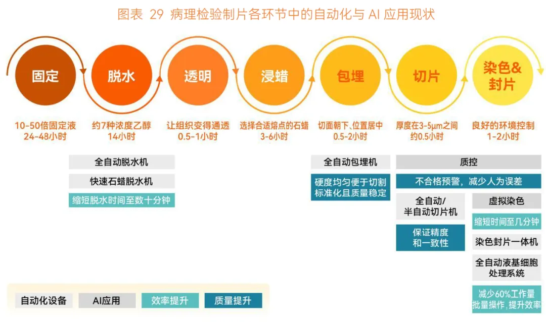 制片环节,自动化 + AI 实现显著提质增效。制片过程步骤繁琐,对操作精度和时间控制要求高,自动化设备完成重复性、高精度动作,AI 则扮演 “监督” 和 “预判” 角色,实时确保制片准确与标准。自动化与 AI 的应用缩短了制片时间、提高了制片质量,解放了病理医生,使其能将更多时间投入阅片、诊断等核心环节。