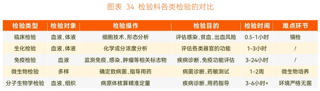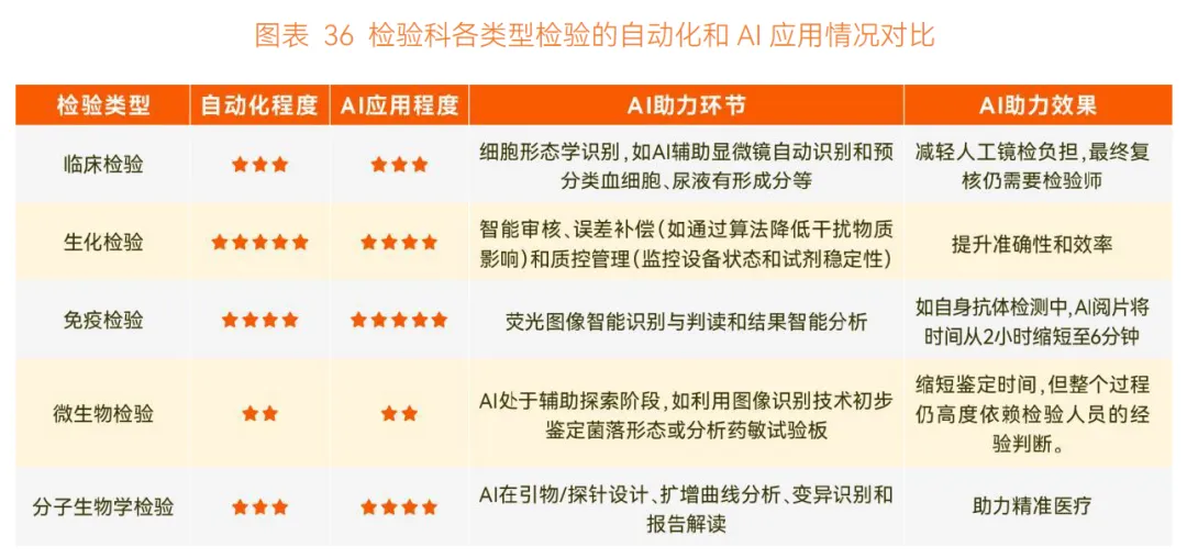 检验科负责临床检验、生化检验、免疫检验等多种类型的检验工作,要求医生 “一专多能”。不同检验类型的自动化、数字化进展不同,AI 渗透程度差异较大:生化检验、免疫检验、临床检验自动化程度高,分子生物学检验自动化程度快速提升,微生物检验因依赖人工培养,自动化程度最低。