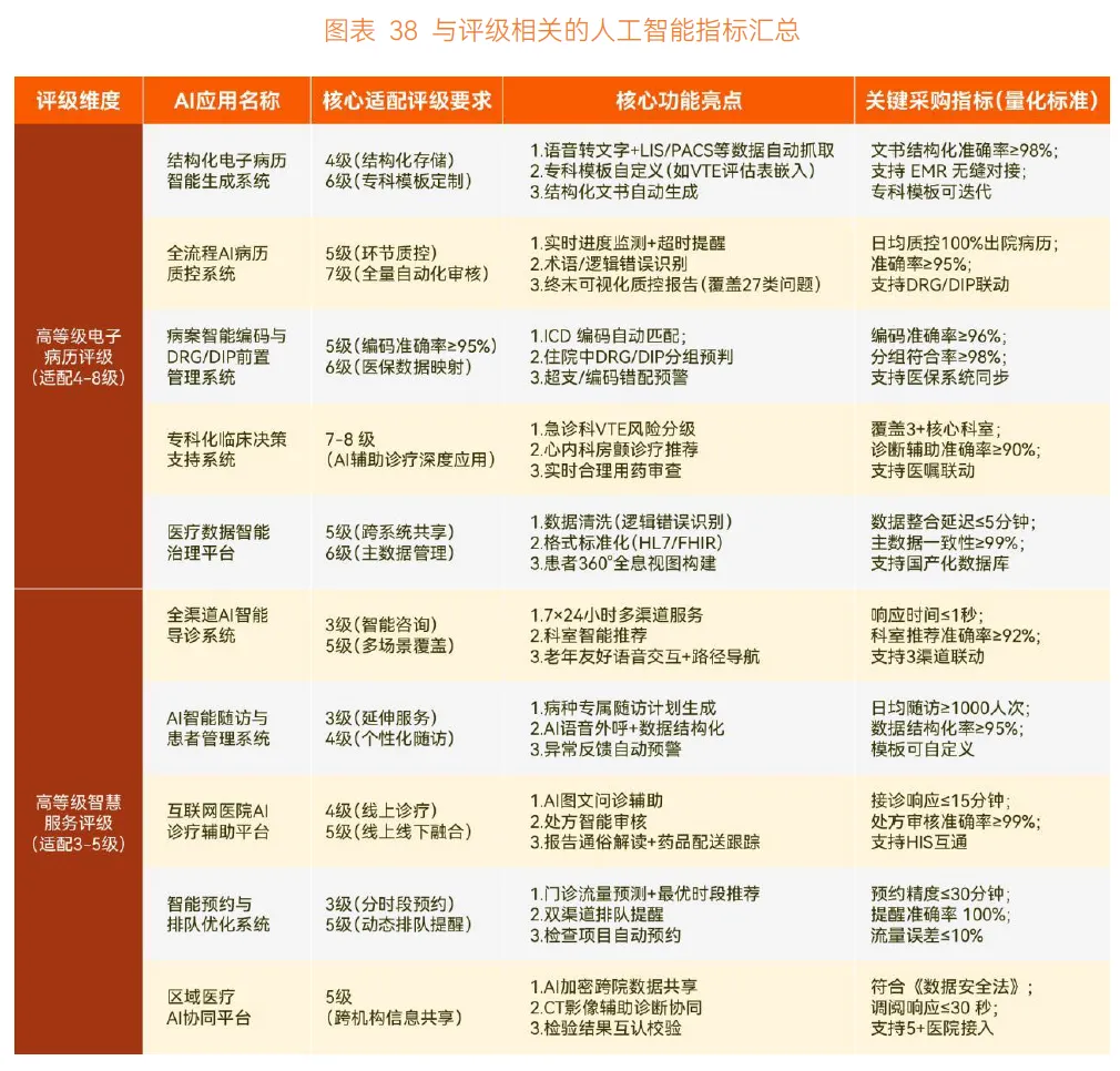 评级需求的智能化应用也受医院关注,高等级电子病历评级、高等级智慧服务评级相关的 AI 应用,如结构化电子病历智能生成系统、全流程 AI 病历质控系统、病案智能编码与 DRG/DIP 前置管理系统、AI 智能导诊系统等,既能满足评级要求,又能提升诊疗效率、改善患者体验、建立医院品牌形象。