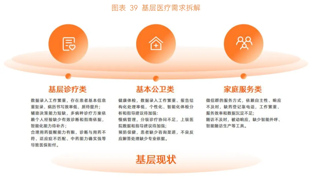 基层医疗核心职能划分为基层诊疗、基本公卫和家庭医生,AI 主要解决 “缺人” 难题:基层诊疗缺乏中级及以上医疗人才,需 AI 补足 “能力需求”;基本公卫和家庭医生工作繁重,人手有限,需 AI 补足 “人力需求”。