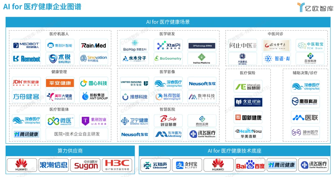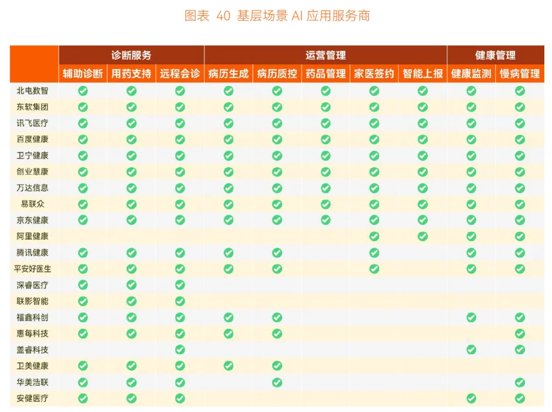 不同于等级医院的方案设计逻辑,基层医疗 AI 解决方案强调标准化、全科、全流程、区域化特征,实现核心环节全覆盖及整体效率最大化提升。目前从事基层医疗解决方案研发的 AI 企业以泛场景互联网企业与医疗信息化企业为主,主流打法是建立知识库并输入头部医院病历文书和诊疗经验,训练满足基层医生需求的智能化应用。
