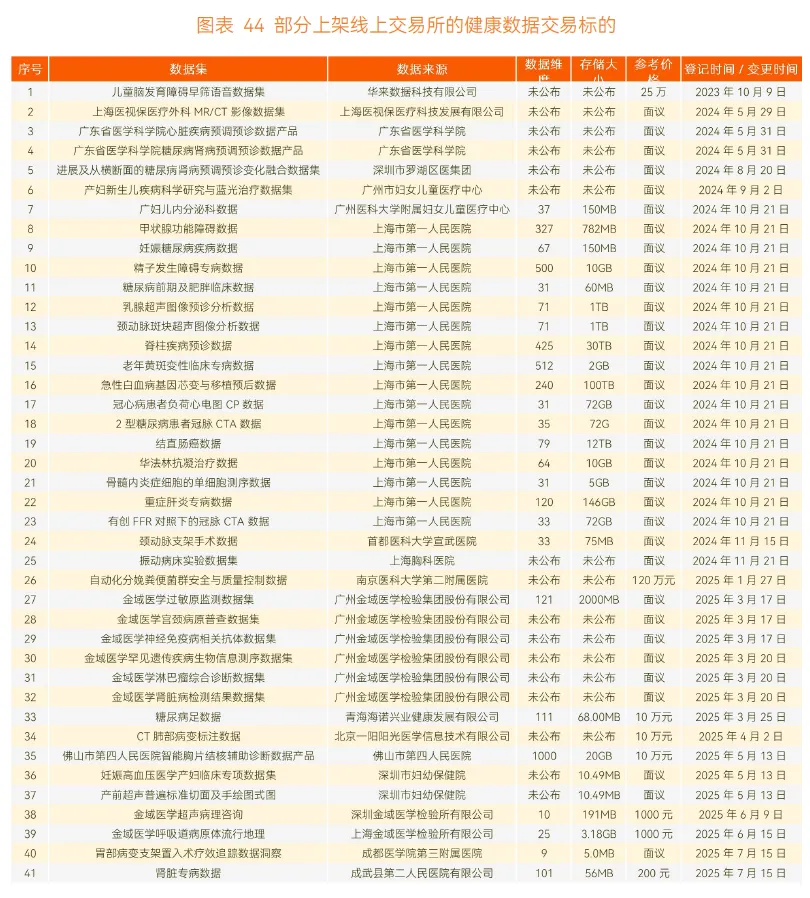 2025 年中国数据交易所健康数据整体交易量有提升但幅度有限,受多重因素制约:健康数据权属复杂,具备个人数据与公共数据双重属性,权利主体多样化,权属问题是市场化应用的前提;缺乏统一定价标准,现阶段主要通过交易双方协商定价;各医疗机构健康医疗数据格式和标准不统一,数据整合技术难度大,且部分医院无法提供高频数据集更新服务,导致数据需求方购置成本居高不下。