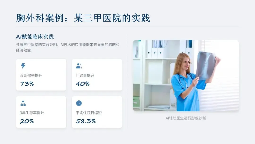 手术规划环节,AI 将自动化引入肺部三维建模,解决传统 3D 重建手工分割耗时的问题,能清晰呈现结节与肺段、亚段的解剖关联,帮助医生确定精准切除范围,避免过度切除正常肺组织。相关研究显示,人机协同下解剖变异识别准确率提升 8%,误差减少 41%,规划时间缩短 25%。哈尔滨医科大学附属第一医院引入 AI 后,患者 3 年生存率提升约 20%,并发症显著减少,平均住院日从 12 天缩短至 5 天,效率提升约 58.3%。