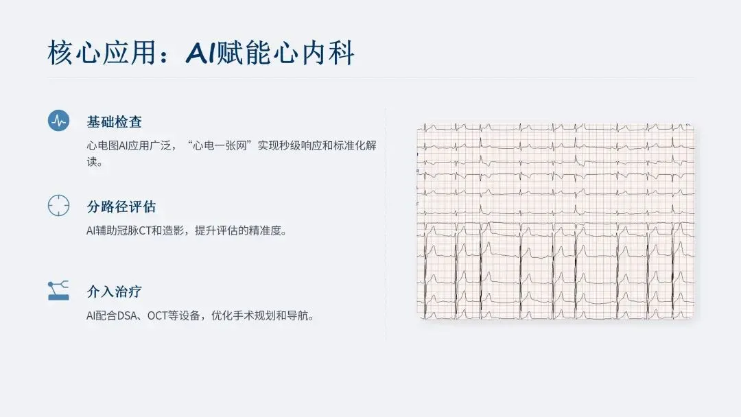 基础检查中,心电图相关 AI 应用最为广泛,院外可穿戴设备、院内专业监测设备均有部署。“心电一张网” 作为区域化心电远程诊断网络,以 AI 为核心支撑,实现秒级响应(数秒内完成分析,急诊危急病例快速推送)、标准化解读(诊断准确率达 95% 以上,关键病症识别率超 99%)、降低诊疗门槛(辅助基层医生完成规范采集与初步筛查)、优化资源配置(分流常规病例,聚焦复杂病例)。医生调研反馈,AI 可使问诊效率提高 50%,病历时间缩短 80%,“医生 + AI” 模式综合诊断准确率超 95%。