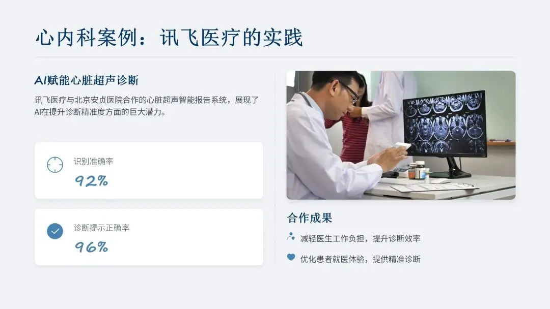 心超领域,AI 可实时引导探头定位、优化图像清晰度,自动完成核心指标量化分析(误差率低于 3%),精准识别多种心脏疾病(关键病症诊断准确率超 95%)。讯飞医疗的多模态大模型心脏超声智能报告系统,在北京安贞医院的应用数据显示,对心脏超声描述的识别准确率达 92%,诊断提示正确率达 96%。
