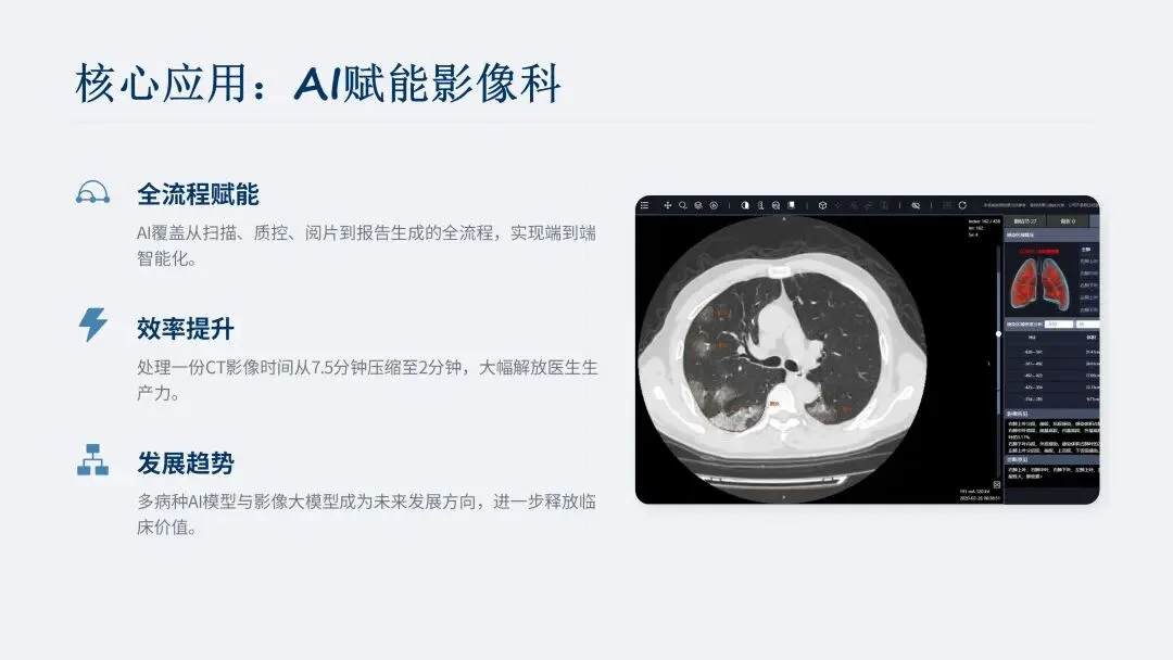 影像科作为多数医院效率提升的短板,是 AI 赋能的核心领域,经过十余年发展,AI 已覆盖自动摆位、影像生成、质控、辅助阅片、报告生成等全流程,将医生从重复性劳动中解放出来,改变了影像科工作流程。