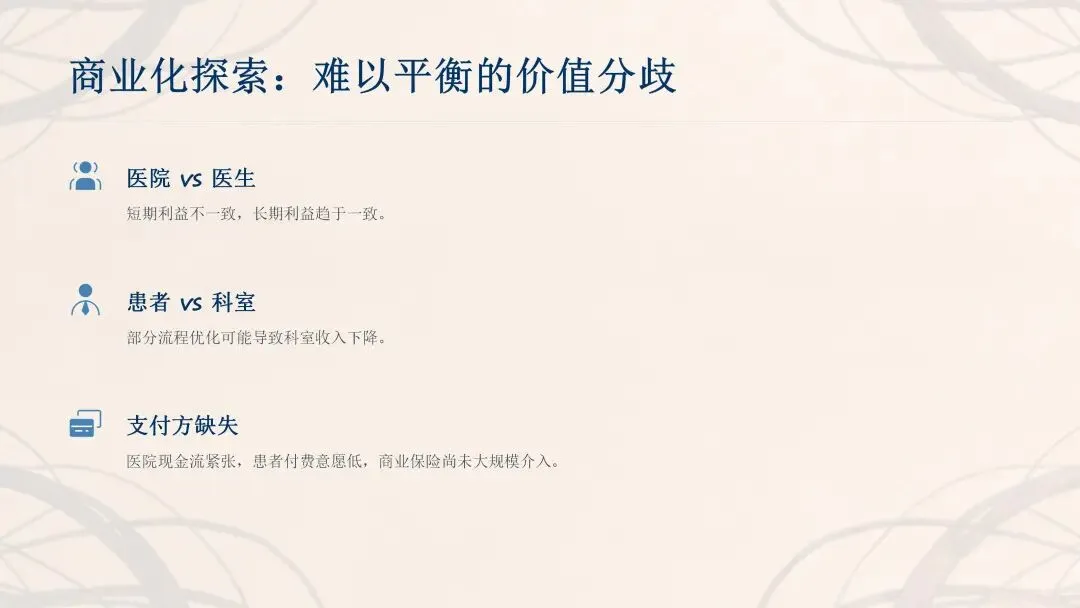 医疗 AI 商业化受阻的核心原因是不同主体间的价值分歧,医院难以精准核算效益,应用产生的诊疗效益也未必能转化为医院价值。