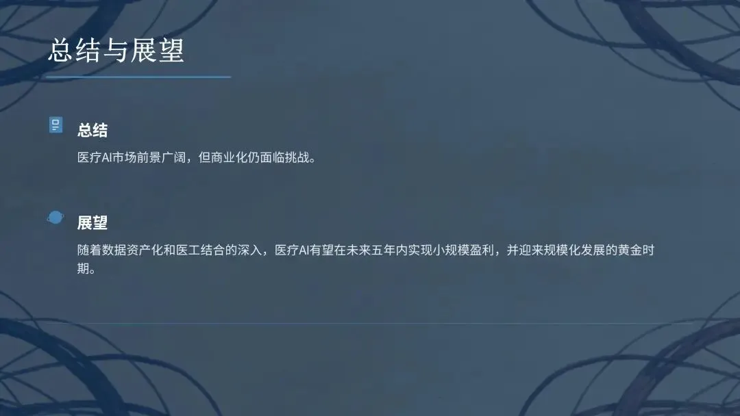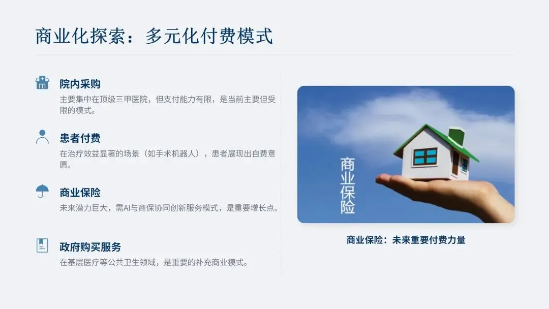 探索患者作为支付方的商业模式成为重要方向。普通三级医院作为理想商业化对象,受 DRG、检查收费下降等政策影响支付能力削弱,医生普遍希望 AI 企业向患者收取服务费用,但目前能带来明显治疗效益、符合患者付费逻辑的医疗 AI 应用稀少。若患者付费成为主流模式,商保将发挥重要作用,医疗 AI 需提升自身价值,与商保协同创造新服务模式。